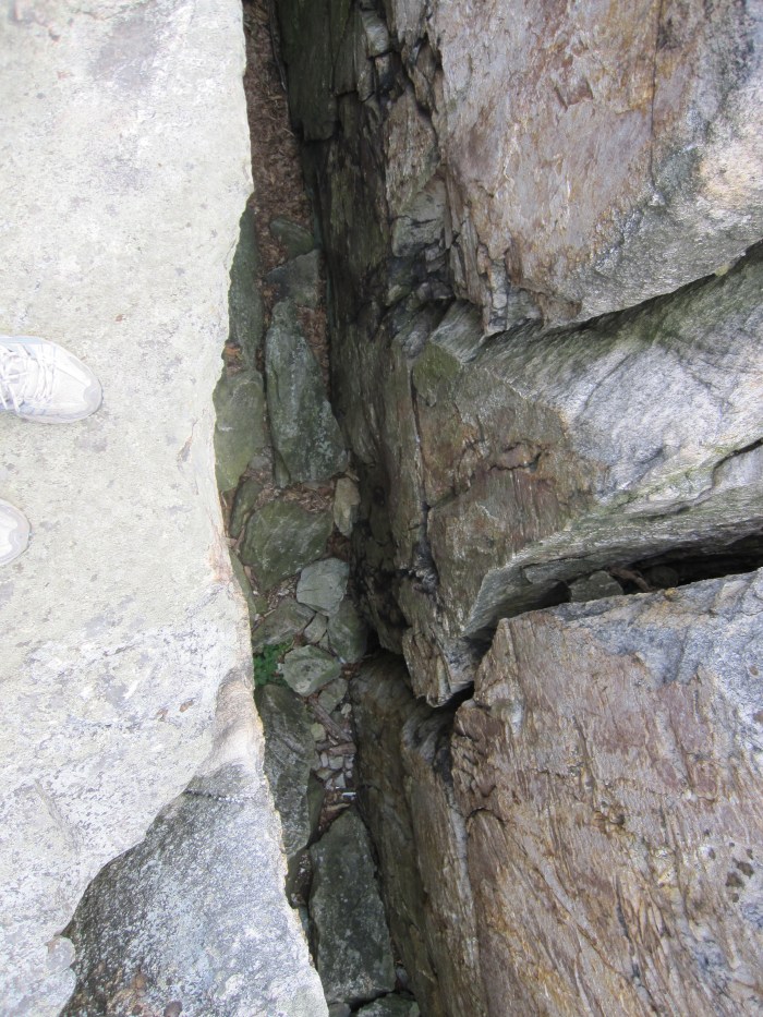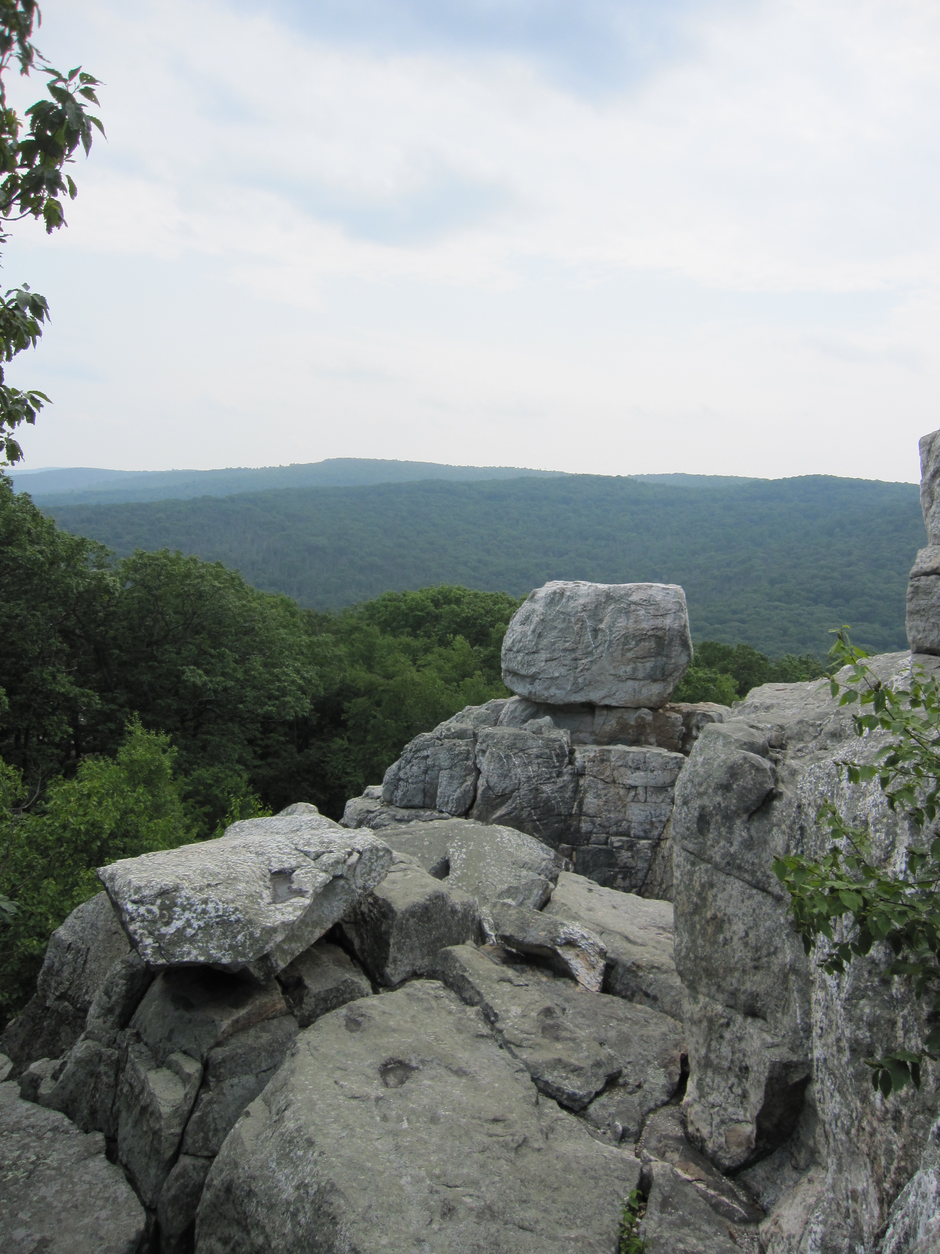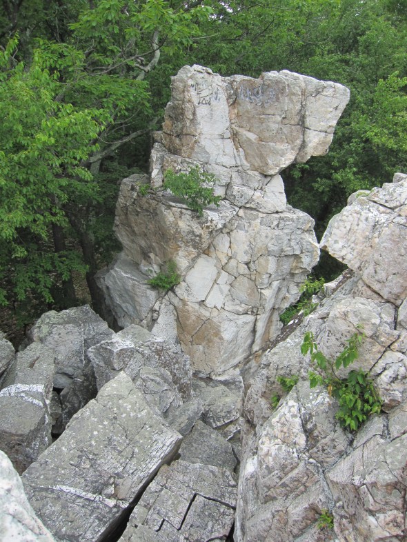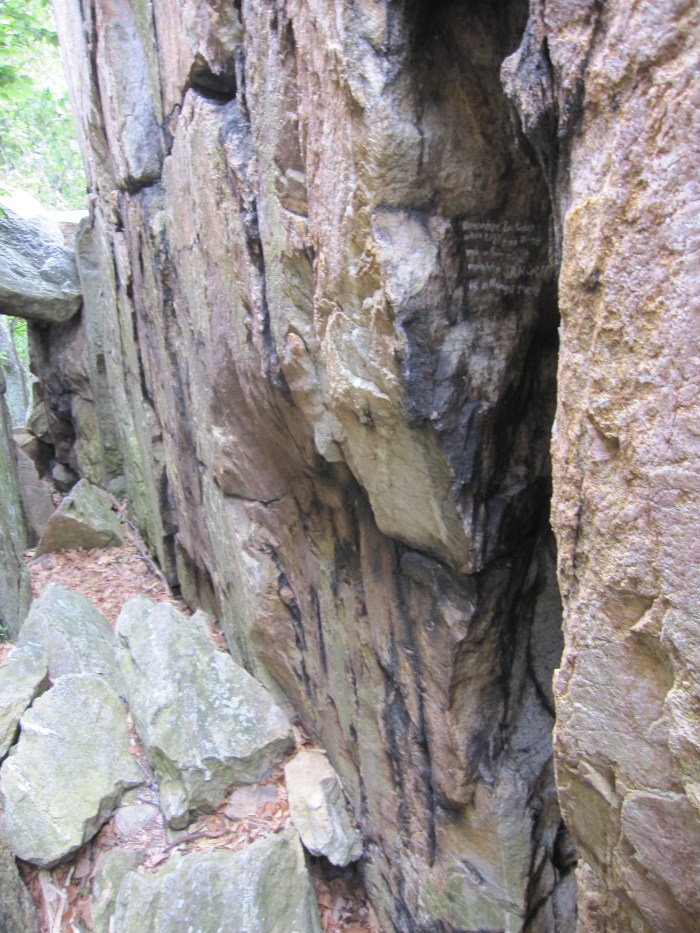 As I’ve mentioned (indirectly) my latest project has to do with erosion and erasure as a process of language erosion. Recently some friends and I went camping at Catoctin Mountain Park in Maryland (the skinny northern part). The landforms we were bouldering to and around, Wolf Rock and Chimney Rock, were ultimately the result of erosion. The mountains themselves used to be much much higher, but have cascaded around themselves over time, with massive beautiful white stacks of rock (quartzite) remaining while softer materials have eroded away. The resulting rock structures are stunning stacks, deep crevices, and massive boulders.